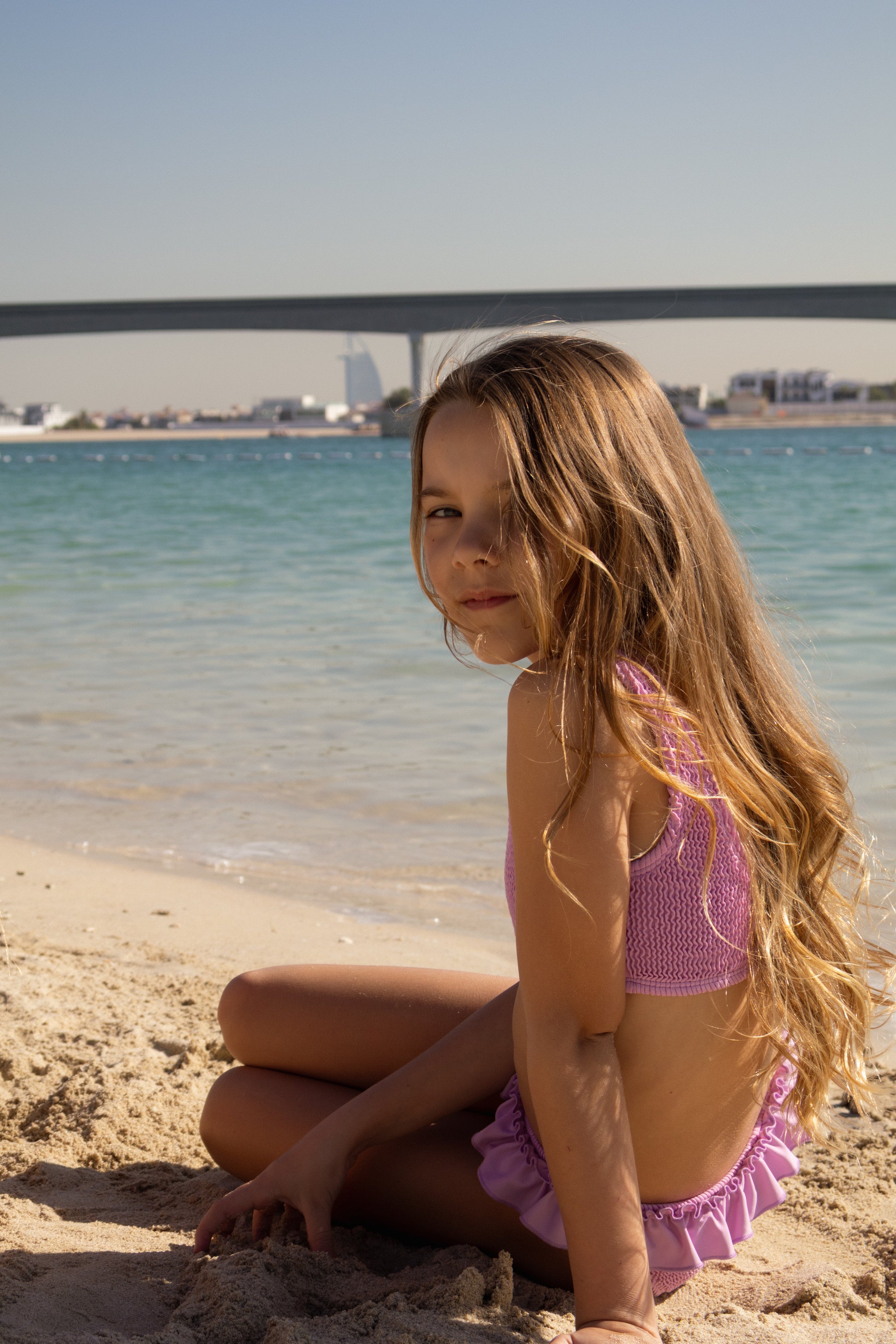 Our iconic bikini in our new purple colourway! This bikini features our classic top and ruffle bottoms with new contrasting frill! Made in our signature soft crinkle fabric, designed to stretch with your little one.