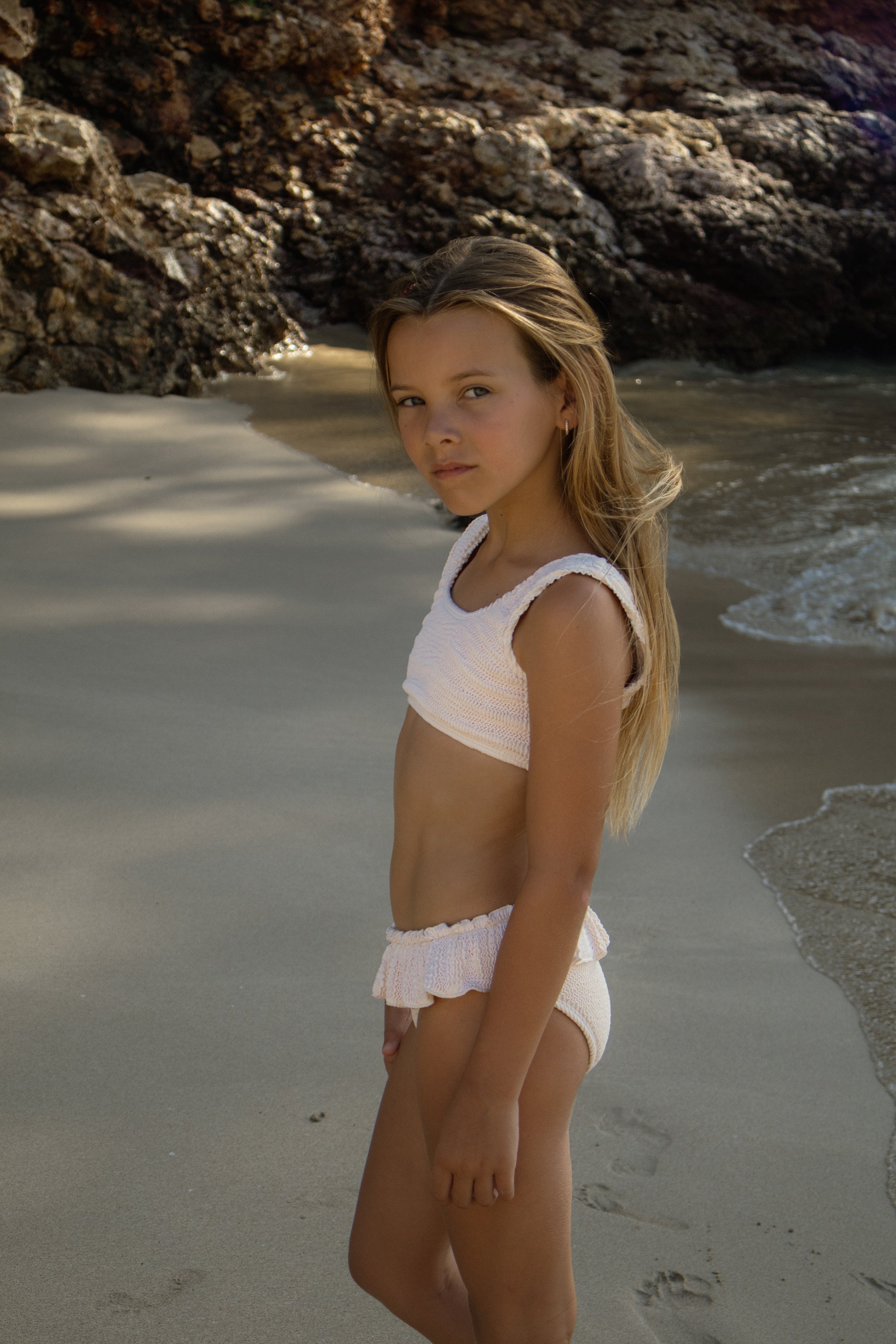 Our iconic bikini in one of our best selling colours, vanilla! This bikini features our classic top and ruffle bottoms. Made in our signature soft crinkle fabric, designed to stretch with your little one.